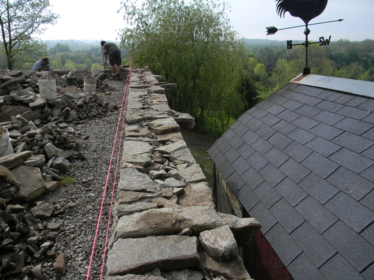 The stone that you see laying in the wall at the end of the clip, with the bucket leaning on it, has been bedded and pinned with the scalloped pieces that came off it when the stone was being shaped earlier.