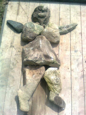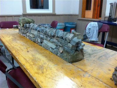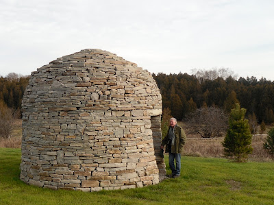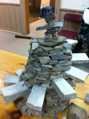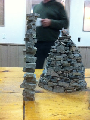 On Saturday of the DSWAC weekend retreat in the Caledon hills we experimented with several different designs for arched dry stone features for the upcoming Rocktoberfest using small stones. This miniature bridge was cleverly constructed by Doug Ball and Angus E in a window opening between the dining hall and the enclosed porch. In an effort to prove how strong arches can be I offered to step up on it and try to put my full weight on it. The tiny bridge didn't collapse, proving what a good design it was and how well it was constructed. The window opening, on the other hand was designed a bit too small. Tuesday, May 17, 2011