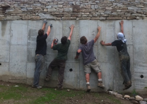 Along with myself and a few guest wallers, Sarah, Chris, Andrea, Kara, Leslie and Ben worked hard to rebuild the wedge over the three days and did a fantastic job. A new shape and smaller height of the wedge was decided upon and the see through tunnel opening was reduced from 18 inches to 12 inches. The new cheese wedge structure now has heavier bigger copes sitting on a much wider top. The weather cooperated and we were happy to finish the structure in less time than the three full days we had allotted for the workshop.